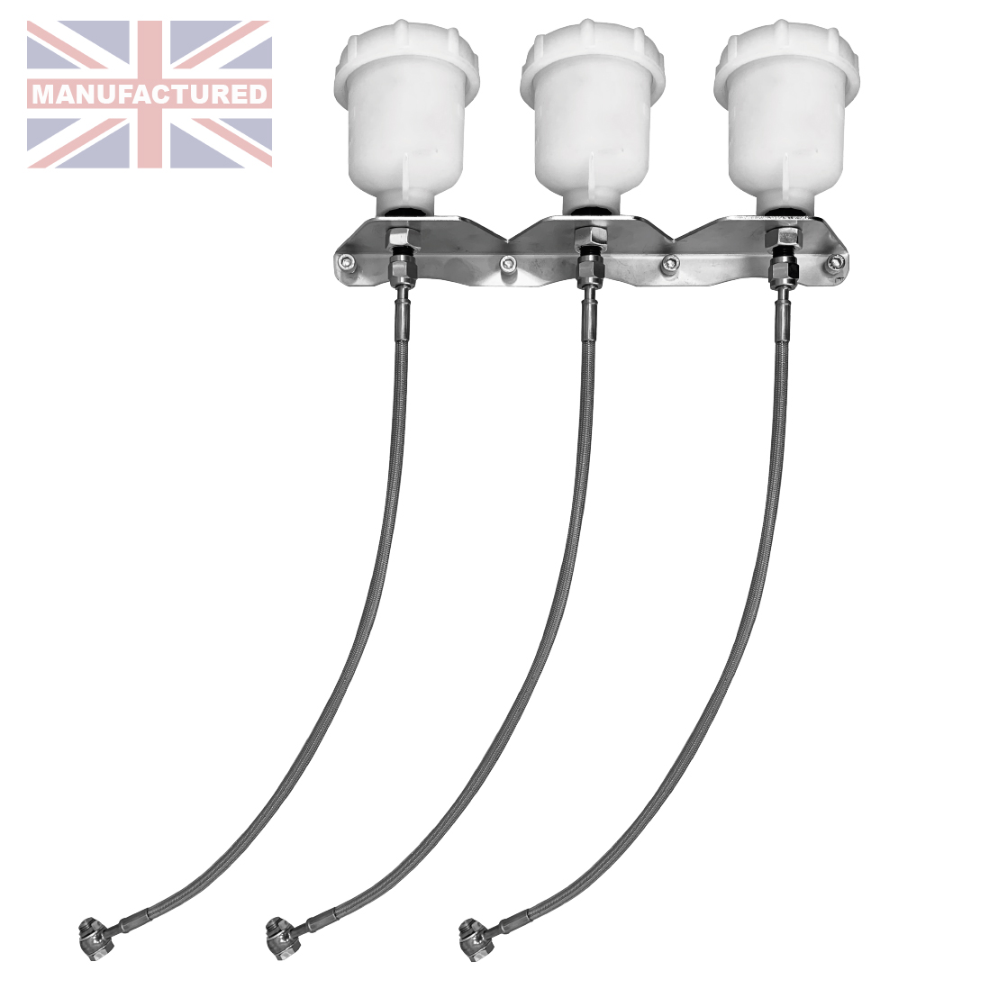 BANJO PEDAL BOX ACCESSORIES KIT [3 X BOTTLES 3 X LINES & TRIPLE MOUNTING BRACKET, PLUS BANJO FITTINGS]