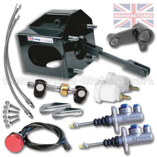 BOX KIT B INCLUDES – BMW E9 CSI BOX PLUS – [2 X AP MASTER CYLINDERS, SWINGING PIVOT, CLEVIS, FIXINGS, BALANCE BAR, 2 X RESERVOIRS, 2 X MOUNTING BRACKETS, REMOTE CABLE ADJUSTER & 2 X BRAKE LINES]