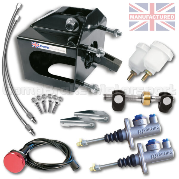 BOX KIT B INCLUDES – ESCORT BOX PLUS – [2 X AP MASTER CYLINDERS, SWINGING PIVOT, CLEVIS, FIXINGS, BALANCE BAR, 2 X RESERVOIRS, 2 X MOUNTING BRACKETS, REMOTE CABLE ADJUSTER & 2 X BRAKE LINES]