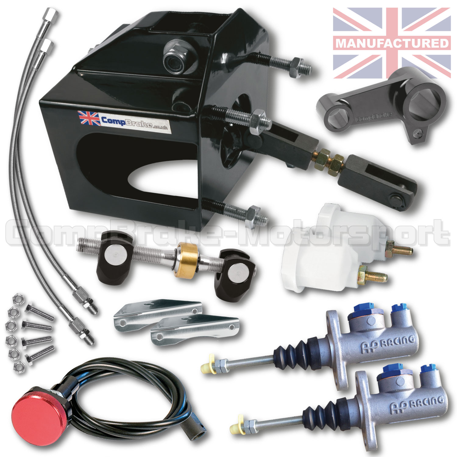 BOX KIT B INCLUDES – PEUGEOT BOX PLUS – [2 X AP MASTER CYLINDERS, SWINGING PIVOT, CLEVIS, FIXINGS, BALANCE BAR, 2 X RESERVOIRS, 2 X MOUNTING BRACKETS, REMOTE CABLE ADJUSTER & 2 X BRAKE LINES]