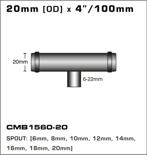T-Piece Alloy 20mm OD x 100mm [4″] Spout Range 8mm-20mm [Specify when ordering]