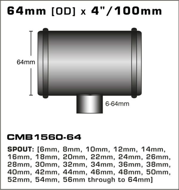 T-Piece Alloy 64mm OD x 100mm [4″] Spout Range 8mm-64mm [Specify when ordering]